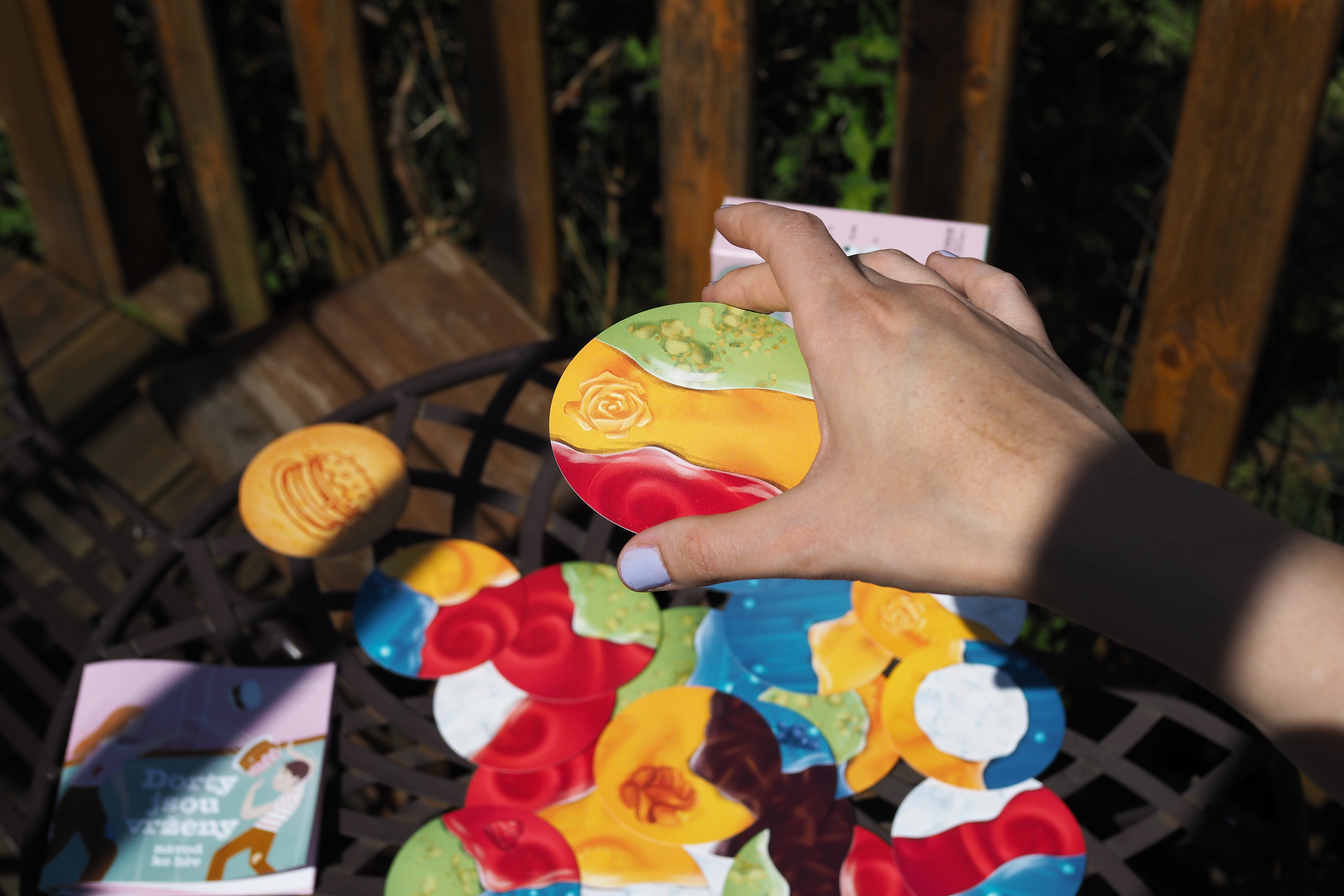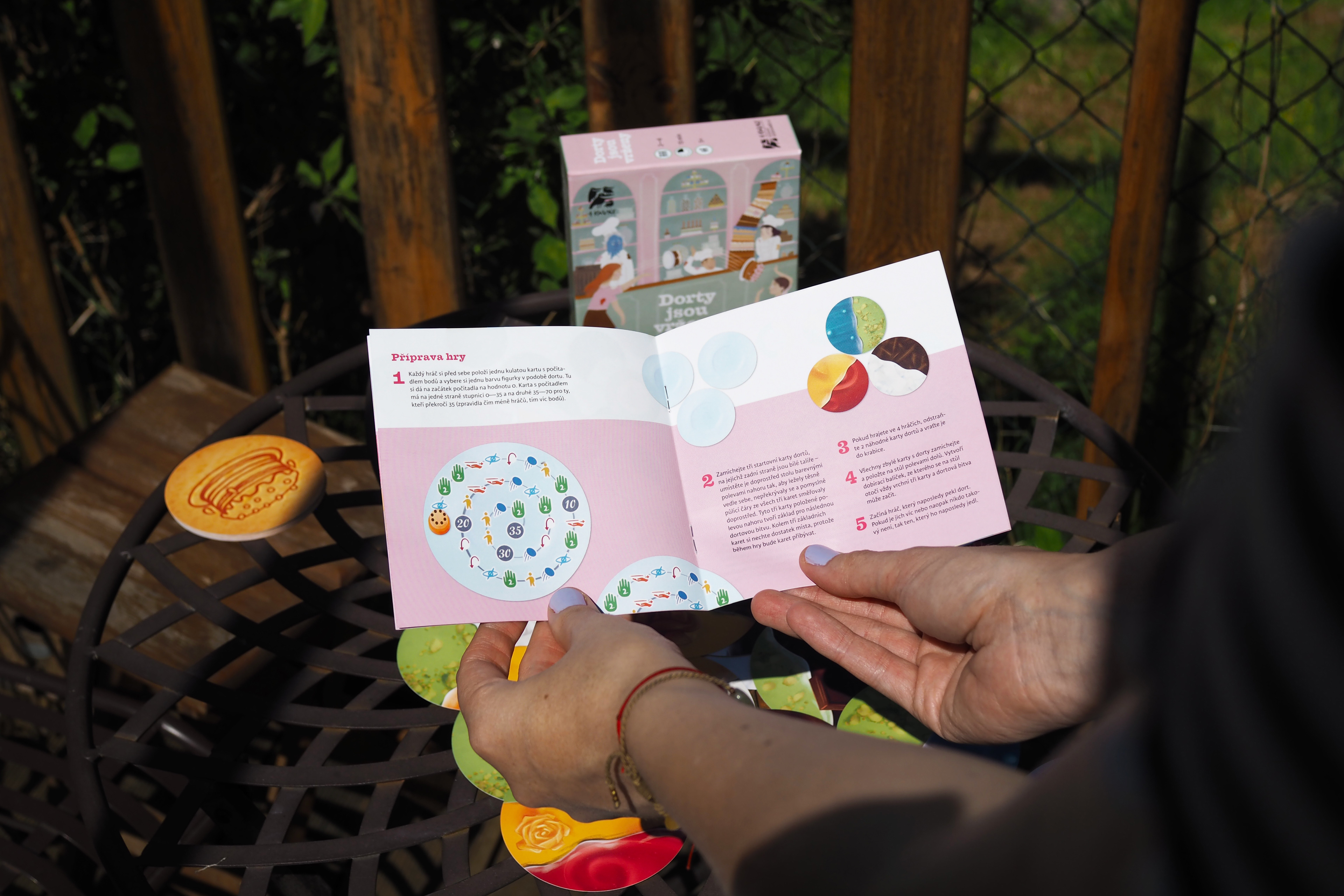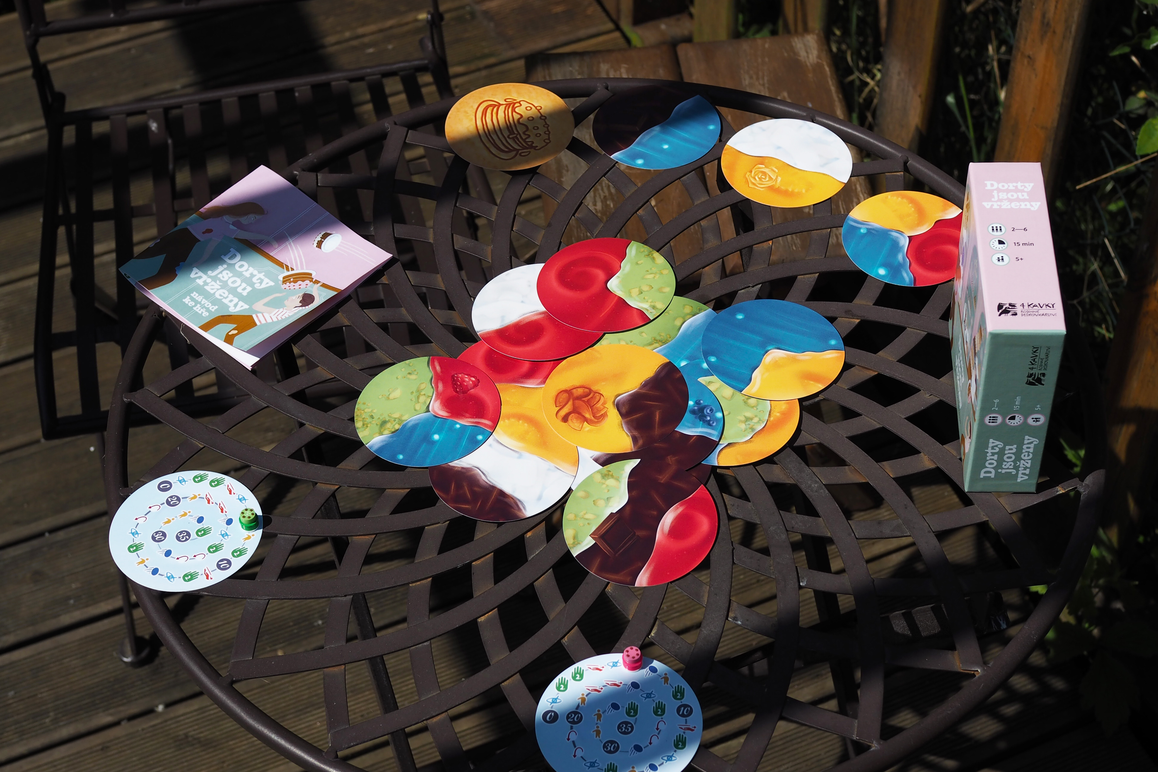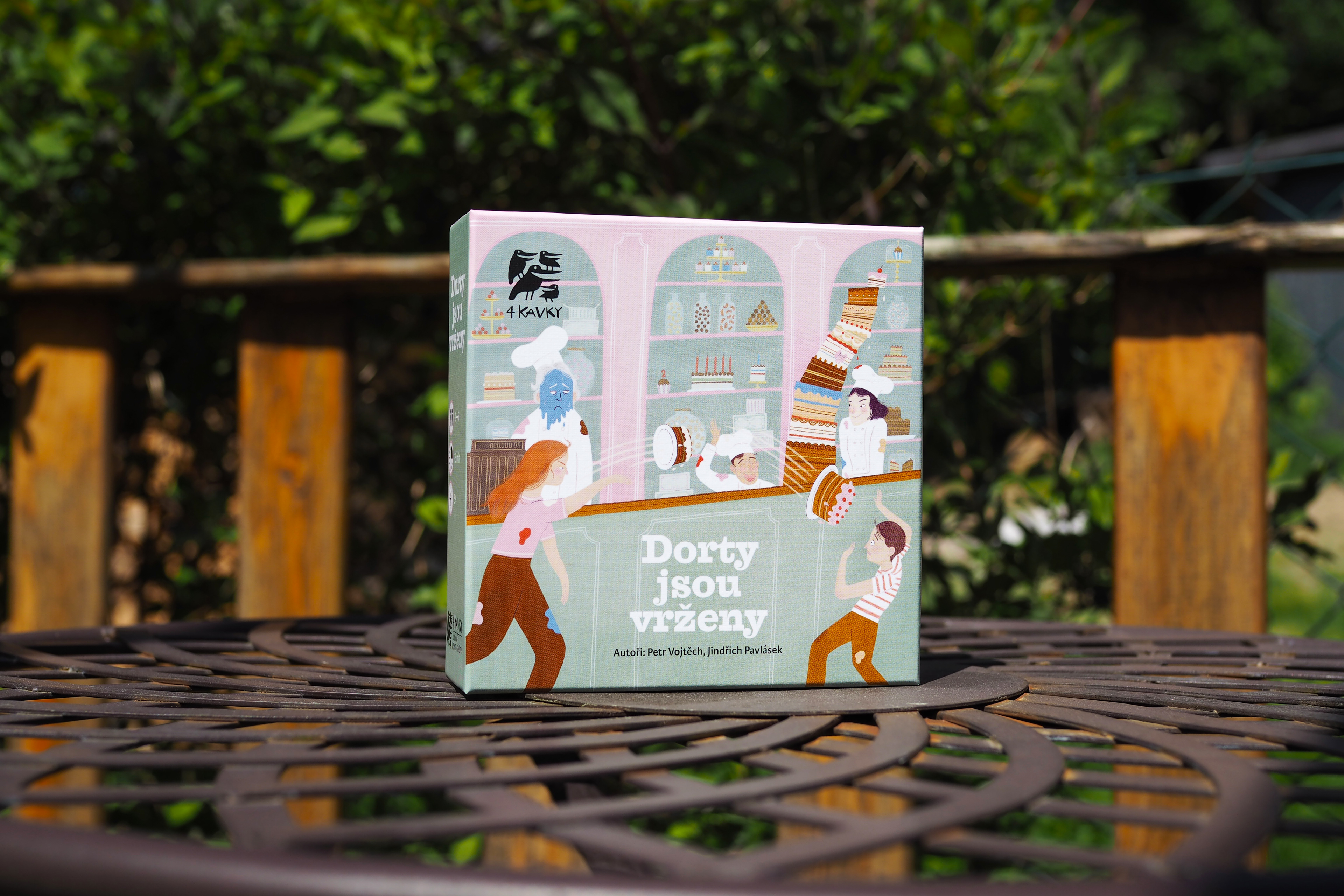 Dorty jsou vrženy ("Cakes are cast") is a dexterity game, where you throw cakes on a table in hilarious ways. 2-6 players will test their skills to score the largest icings.